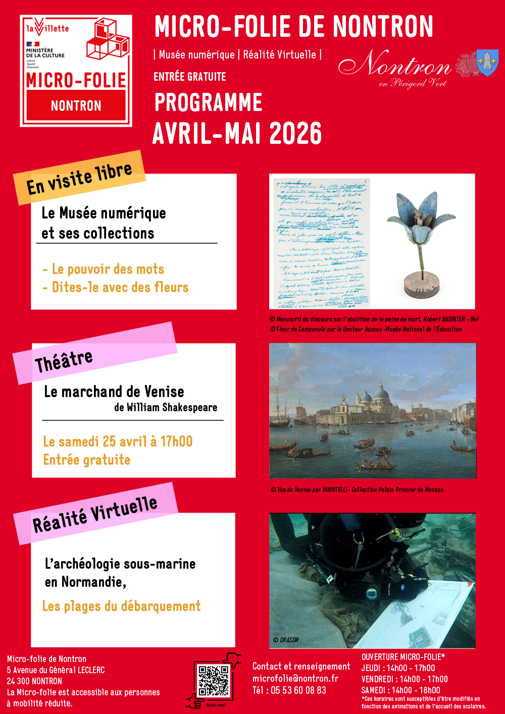 Horaires : Jeudi : 14h00 à 17h00 Vendredi : 14h00 à 17h00 Samedi : 14h00 à 18h00 Entrée gratuite